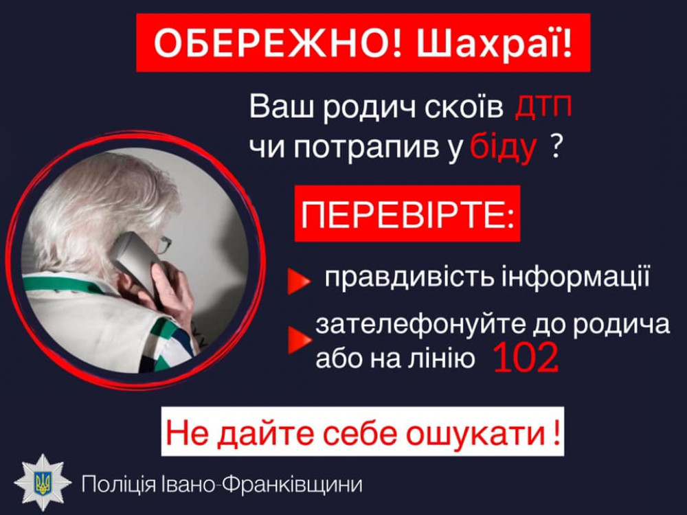 До поліції Коломийського району надійшло звернення від 91-річної мешканки районного центру. При спілкуванні з правоохоронцями жінка повідомила, що невідомі особи видурили у неї 86 500 гривень. Спершу на домашній телефон до потерпілої зателефонувала нібито її дочка і повідомила, що в Білорусії вчинила ДТП, у якій є постраждалі. Для її порятунку від ув’язнення «псевдодонька» попросила у матері гроші.