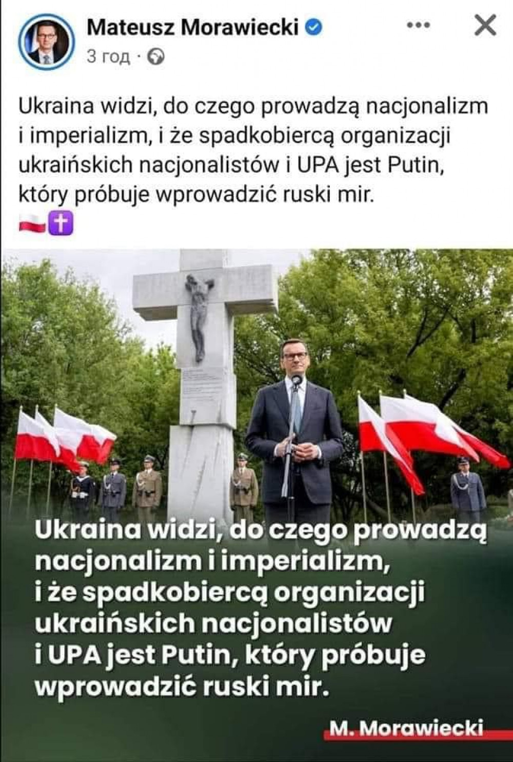 "Що спільного між Моравецьким і Путіним? Скажете, абсурдне питання – Путін напав на Україну, а Польща, уряд якої очолює Тадеуш Моравецький, допомагає Україні захищатися.Але насправді, це не більший абсурд, аніж скандальні порівнювання Моравецьким правителя Московщини Путіна із УПА, що боролася за звільнення України від Московщини. Кожен національний лідер оцінює світові процеси зі своєї дзвіниці. І якщо Моравецький порушив питання національної пам’яті саме так, як він це зробив, то в них із Путіним спільна дзвіниця – імперсько-колоніалістський спосіб мислення.
