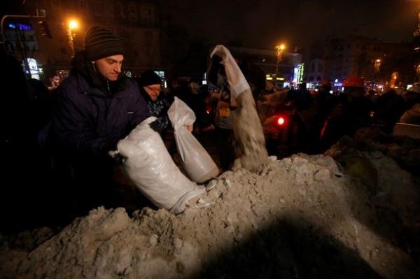 Побоюючись нових спроб розгону мирного мітингу, учасники протестів зробили загородження ще ширше, вище і неприступне: крім дерев'яних балок, різних металоконструкцій і вуличних лавок, люди використовували мішки зі снігом і льодом, заливаючи при цьому свої споруди водою і обмотуючи колючим дротом.