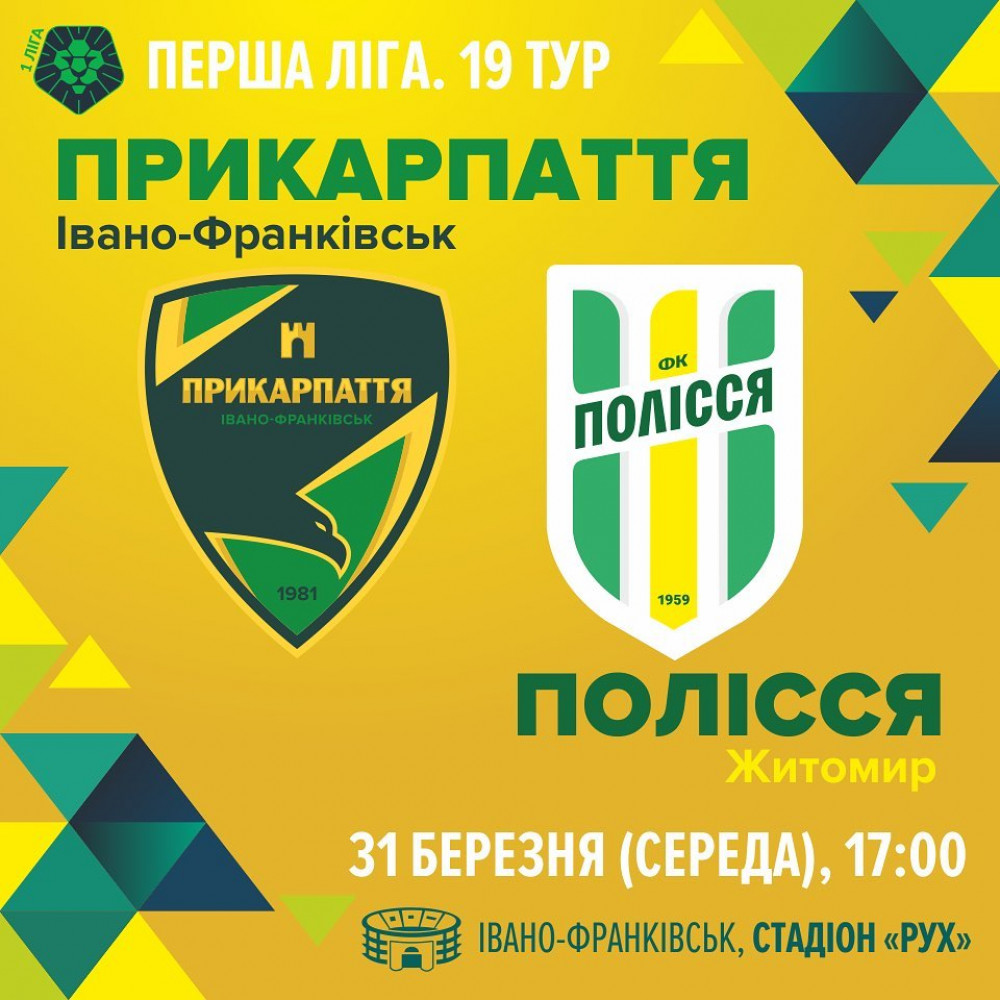 Сьогодні івано-франківське "Прикарпаття" на стадіоні "Рух" прийматиме житомирське "Полісся". Матч відбудеться без глядачів, початок гри о 17-й годині.