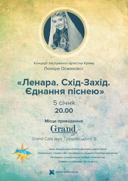 5 січня, Гранд-кафе театру кіно “Люм’єр” та проект “Схід і Захід разом: Різдво в Карпатах” запрошує всіх охочих познайомитися з кримсько-татарською культурою та послухати як співає Кримська душа. Вперше в Івано-Франківську із сольним концертом заслужена артистка Криму Ленара Османова. Захід розпочнеться о 20:00.
