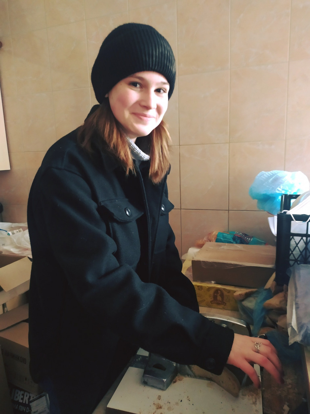 Єва ділиться: "Як тільки ми приїхали до міста я твердо вирішила, що маю волонтерити! Я дуже люблю готувати, тому, побачивши благодійну їдальню на площі відразу звернулася туди. Переживала, що мене не візьмуть через мій вік, але дарма. Почала допомогати носити їжу, а згодом включилася і в інші процеси. Батьки підтримали мене. Я отримую моральну підтримку від того, що допомагаю людям".