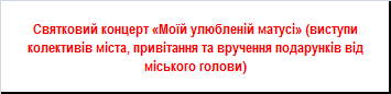Святковий концерт «Моїй улюбленій матусі» (виступи колективів міста, привітання та вручення подарунків від міського голови)