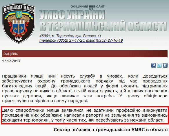 «До обов’язків людей у формі входить підтримання правопорядку не лише в області, в якій вони служать, а й в інших населених пунктах держави, якщо виникає така потреба. У цьому міліціонери присягнули на вірність своєму народові. Деякі співробітники міліції виявилися нездатними професійно виконувати покладені на них обов’язки: написали рапорти на звільнення та відмовились захищати тернополян, у тому числі тих, які перебувають за межами області», – йдеться у повідомленні.