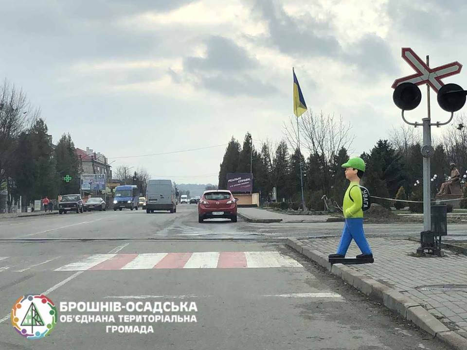 Нагадаємо, у березні у Брошнів-Осаді поблизу трьох пішохідних переходів, що розташовані неподалік навчальних закладів, працівники селищної ради встановили попереджувальні манекени. Вони мають вигляд школярів, які намагаються перейти дорогу. На наплічнику великими літерами написано "Увага".