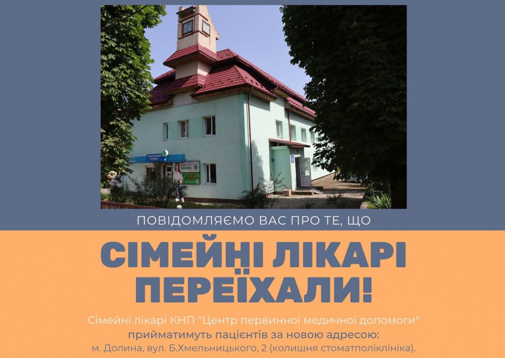 Відтак, тепер прийматимуть долинян за новою адресою:м. Долина, вул. Б.Хмельницького, 2 (колишня стоматполіклініка). Про це йдеться на сайті Долинської міськради.