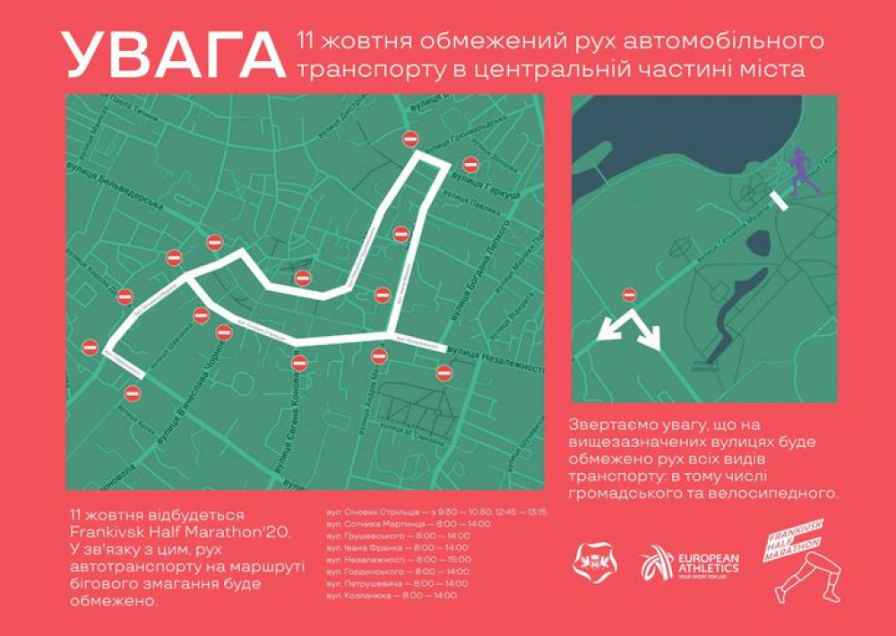 На виконання рішення виконавчого комітету від 01.10.2020 р. № 1023 "Про проведення Франківського Півмарафону 2020" у неділю, 11 жовтня, буде обмежений рух транспорту.