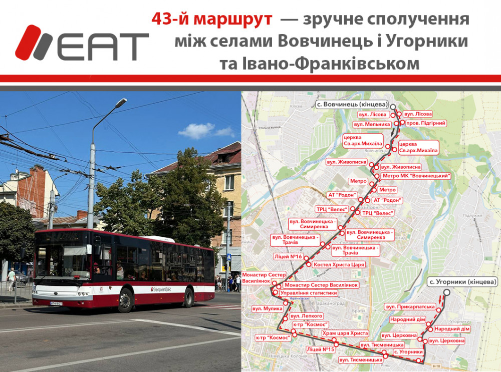 Із 25 серпня в Івано-Франківській територіальній громаді почне курсувати новий комунальний автобусний маршрут №43. Він сполучає приміські села Вовчинець і Угорники.