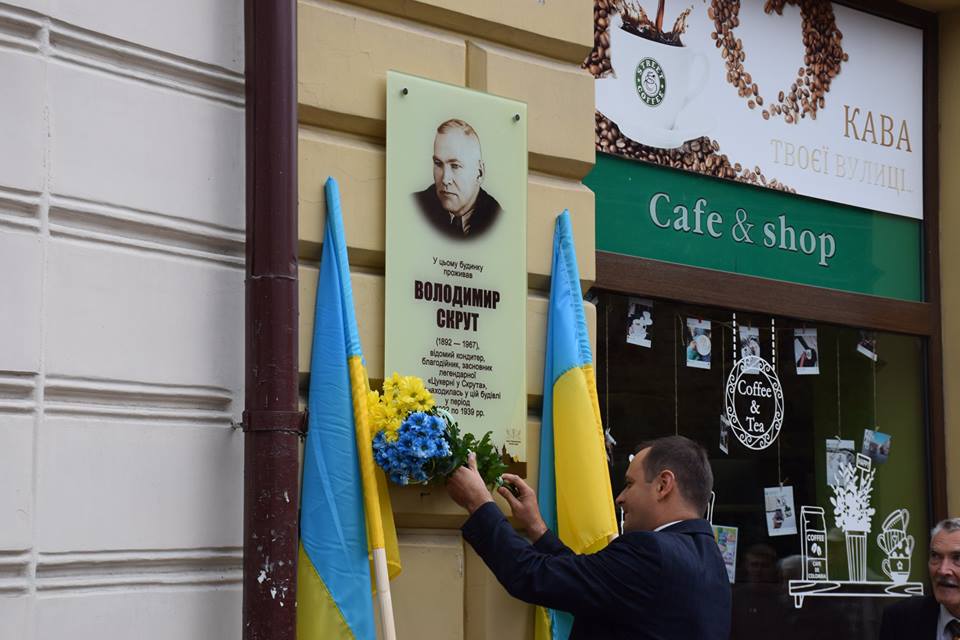 У п’ятницю, 15 вересня, на фасаді будинку Мазепи 4 відкрили анотаційну дошку відомому станіславському кондитеру та благодійнику, засновнику легендарної «Цукерні у Скрута» Володимиру Скруту. Пам’ятний знак встановили на будівлі, де проживав та працював майстер солодощів.