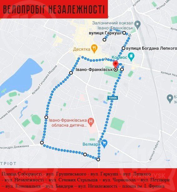 Площа Соборності - вул. Грушевського - вул. Гаркуші – вул. Лепкого – вул. Незалежності – вул. Січових Стрільців – вул. Чорновола – вул. Петлюри – вул. Коновальця – вул. Бандери – вул. Незалежності – площа ім. І. Франка. Рух буде частково обмежено з 09:30 год за фактом руху колони та до завершення велопробігу!