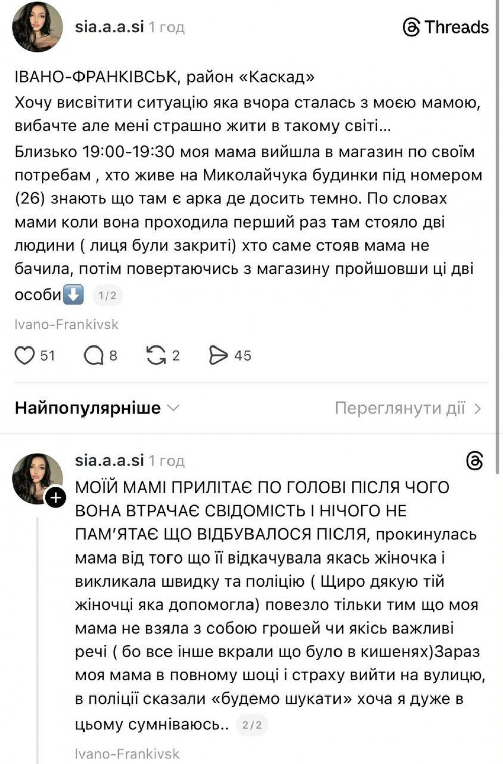 «Моїй мамі прилетіло по голові, після чого вона втратила свідомість і не пам’ятає, що відбувалося далі. Прийшла до тями вже після того, як їй надала допомогу випадкова перехожа, яка викликала швидку та поліцію", - розповідає франківка.