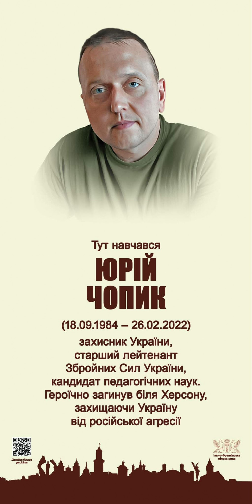 29 липня о 13:00 в Івано-Франківську на фасаді Івано-Франківського ліцею № 17 (Набережна ім. В.Стефаника, 16 А) встановлять пам’ятну дошку Герою Юрію Чопику.