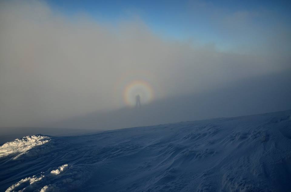 Довідково: Брокенський привид (нім. Brockengespenst) також називають гірський привид — це рідкісне оптичне явище в горах, коли спостерігач бачить свою тінь на поверхні хмар (туману) в напрямку, протилежному до Сонця. Ця тінь може здаватися дуже великою, іноді вона оточена кольоровими кільцями (так звана глорія). Також привид може рухатись (іноді абсолютно несподівано) це пов'язано з рухом хмарного шару та коливанням щільності хмар.