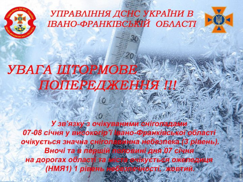 У зв’язку з очікуваними снігопадами 7-8 сiчня у високогiр’ї Iвано-Франкiвської областi очікується значна сніголавинна небезпека (3 рiвень).