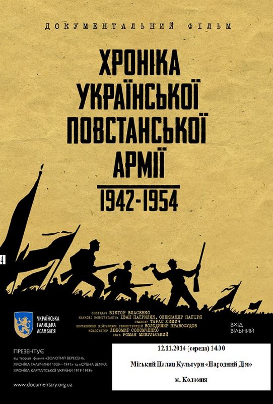 12 листопада коломияни та гості міста зможуть переглянути документальний фільм "Хроніка Української Повстанської Армії 1942-1954". Захід відбудеться у Палаці культури "Народний дім". Початок о 14:00 годині. Вхід вільний. Пароль - Слава Україні! Відео НТК.