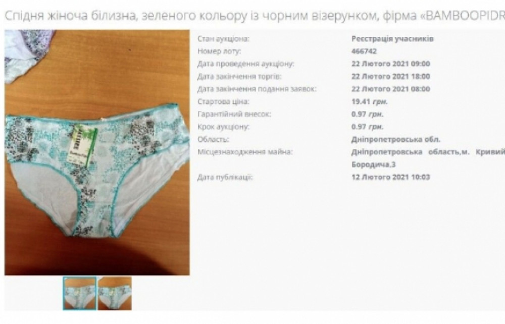 Лот про продаж опублікований в п'ятницю, 12 лютого в системі електронних торгів арештованим майном сетах. Опис лота на сайті звучить наступним чином: "Спідня жіноча білизна, зеленого кольору з чорним візерунком, фірма "BAMBOOPIDRE", розмір L".
