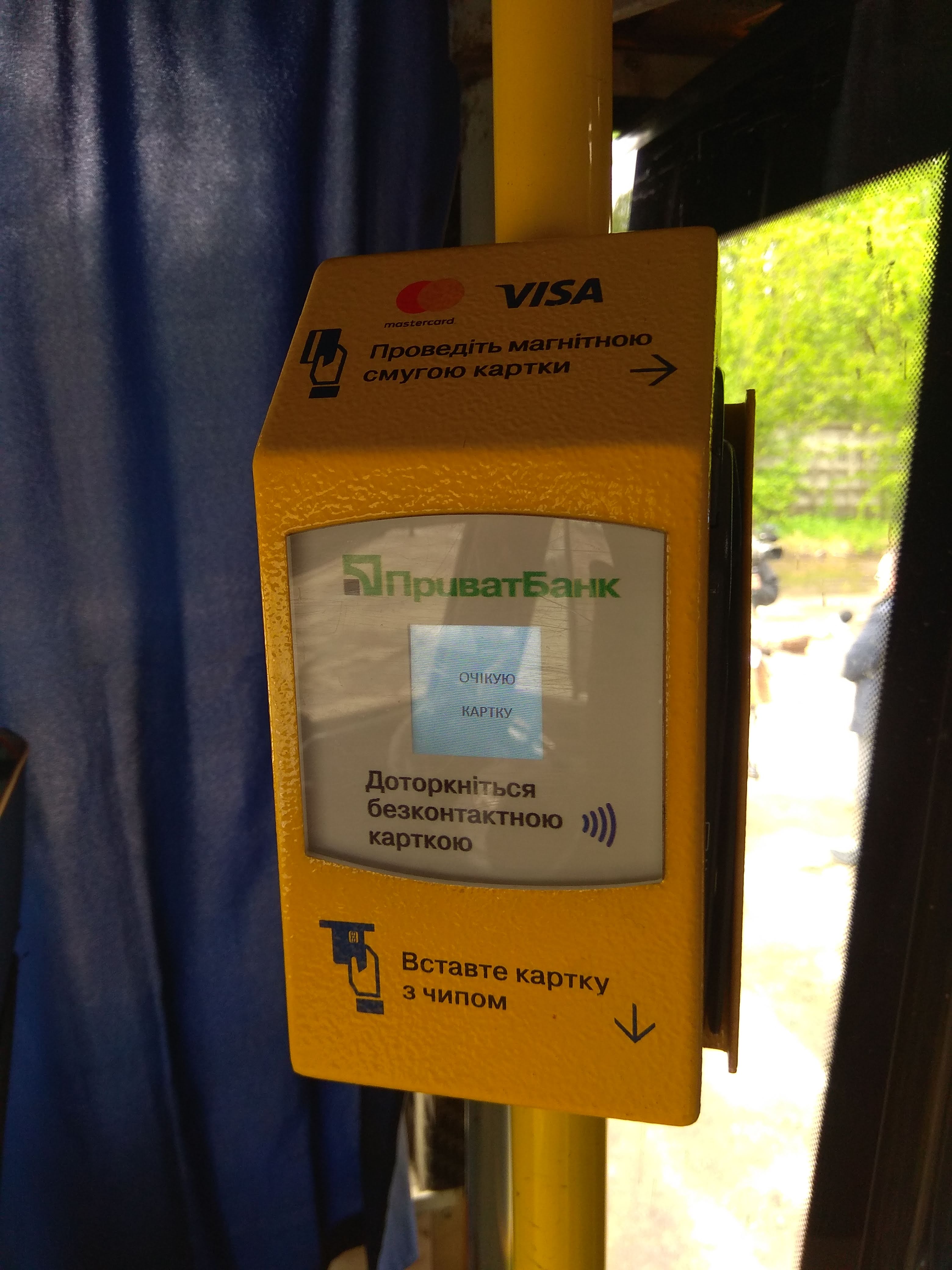 Такі безкоштовні термінали ПриватБанк встановлює в маршрутках, автобусах, тролейбусах і трамваях по всій Україні, за допомогою яких пасажири можуть безготівково сплачувати за проїзд карткою будь-якого банку.