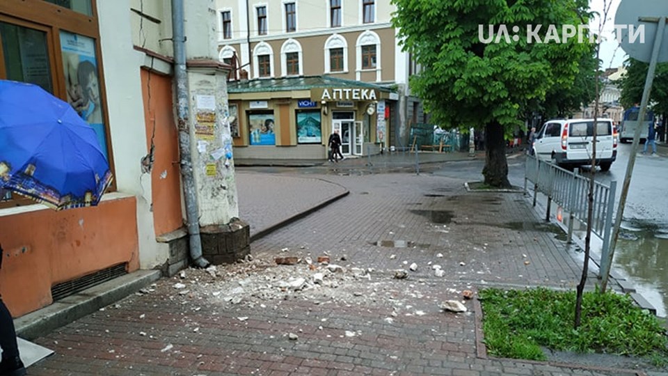 "Відпала частина карнизу будинку, що знаходиться на вулиці Січових Стрільців, 24, в Івано-Франківську. Травмованих немає", - підписали фото UA: Карпати.