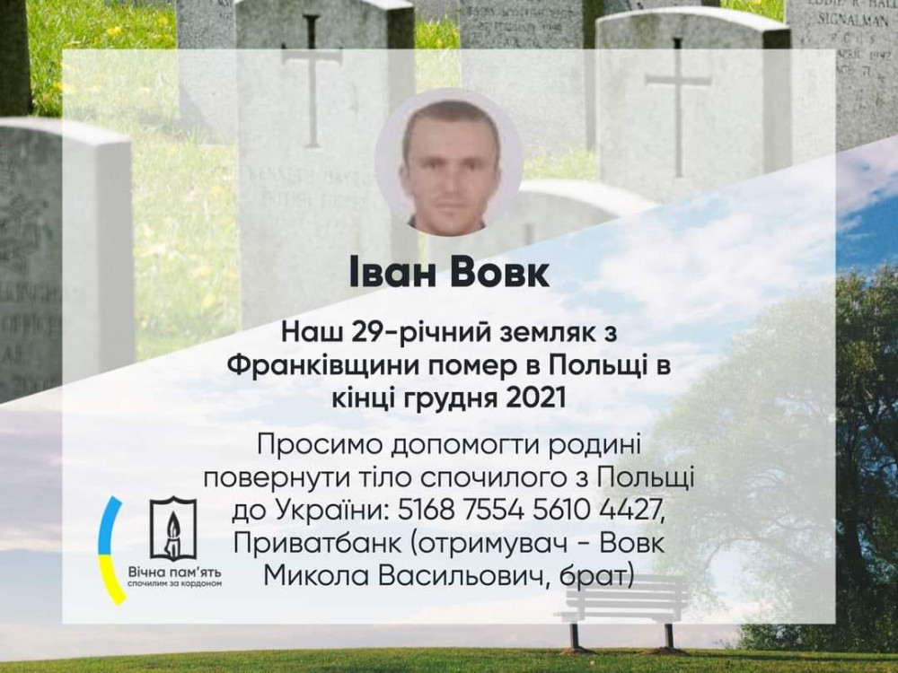 "Просимо щирої молитви за вічний спокій Р.Б.Івана Вічна, світла пам"ять йому. Одночасно звертаємось до небайдужих - хто скільки може - на допомогу згорьованій родині перевезти тіло земляка з Польщі в Україну: 5168 7554 5610 4427, Приватбанк (отримувач - Вовк Микола Васильович, брат)",- йдеться в дописі.