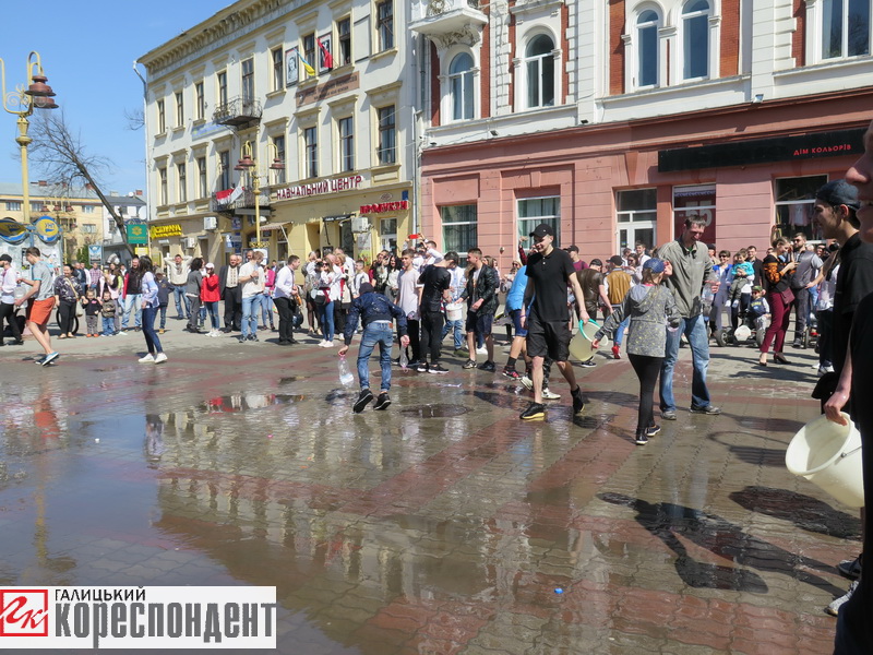 Так франківці вирішили відсвяткувати Поливаний понеділок. Десятки дітей та дорослих тричі обливали один одного водою, пише ГК