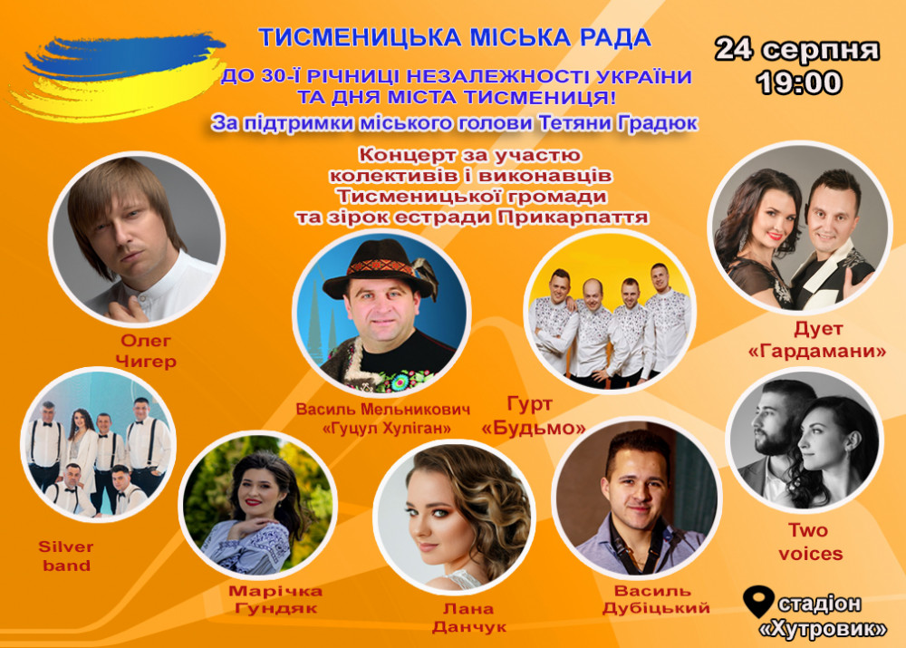 24 серпня, о 19:00 на стадіоні "Хутровик" відбудеться святковий концерт "З Днем народження, Україно!» за участю колективів та виконавців Тисменицької громади та відомих артистів естради Прикарпаття.
