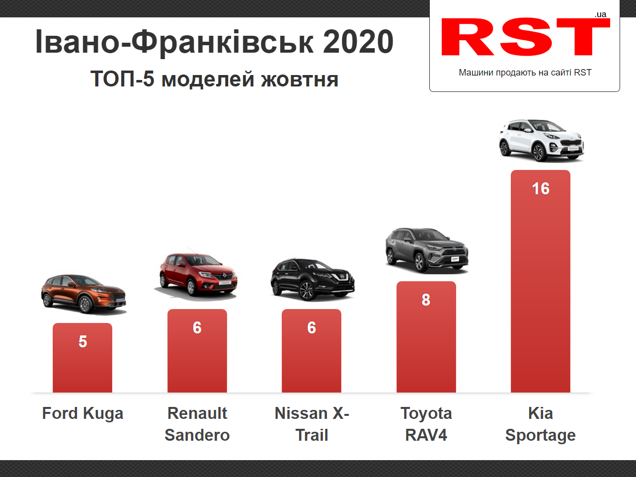 Серед брендів найчастіше реєстрували автомобілі Kia. Минулого місяця на Прикарпатті придбали 16 таких автомобілів. Також популярними були Toyota і Renault. Частка цих трьох брендів склала 43% від загальної кількості продажів у регіоні, – йдеться у рейтингу сайту з продажу автомобілів RST.ua.