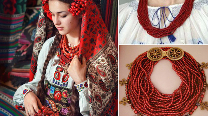 Чи не найпоширенішим на всій Україні було коралове намисто. Червоні коралі на тлі української вишиванки - це неймовірна краса і вишуканість. Традиція носити коралі, пройшовши крізь віки, збереглася й донині, а тому цей вид прикрас нашию ми можемо уявити найкраще. Рожеві з сірим чи червоним відтінком намистини однакової форми, але різного розміру нанизувалися на шовковий шнурок у певному порядку: великі всередині, а менші - по краях. Червоне коралове намисто, як вірили наші пращури, було наділене магічними властивостями: яскраво червоні намистини на жінці означали, що вона здорова, а тьмяні і сіруваті попереджали про хворобу.