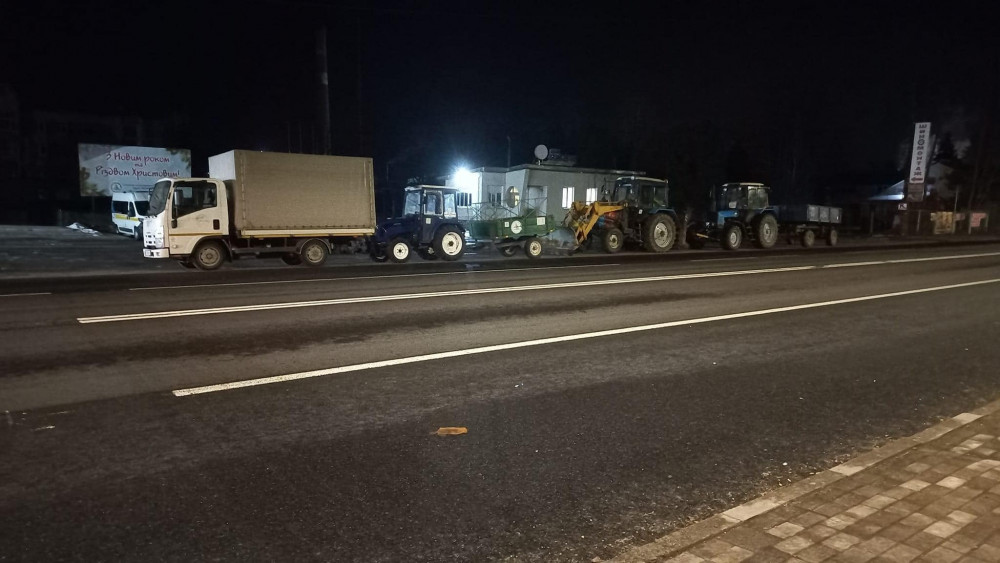 Працівники вишикували техніку вздовж траси навпроти селищної ради і вимагали, щоб їм нарешті виплатили зарплату.