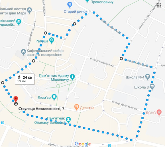 Маршрут: старт - Вічевий майдан - вул. Галицька - Площа Ринок - вул. Шеремети - вул. Старозамкова - вул. Шпитальна - вул. Грушевського - вул. Козланюка - вул. І.Франка - вул. Незалежності (стометрівка) - Вічевий майдан - фініш (два кола).