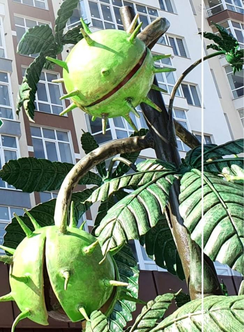 На території житлового комплексу "Містечко Центральне" в Івано-Франківську, на верхньому рівні паркінгу торгового центру "Київський" встановлено ковану композицію – велике гілля з листям та горіхом каштану.