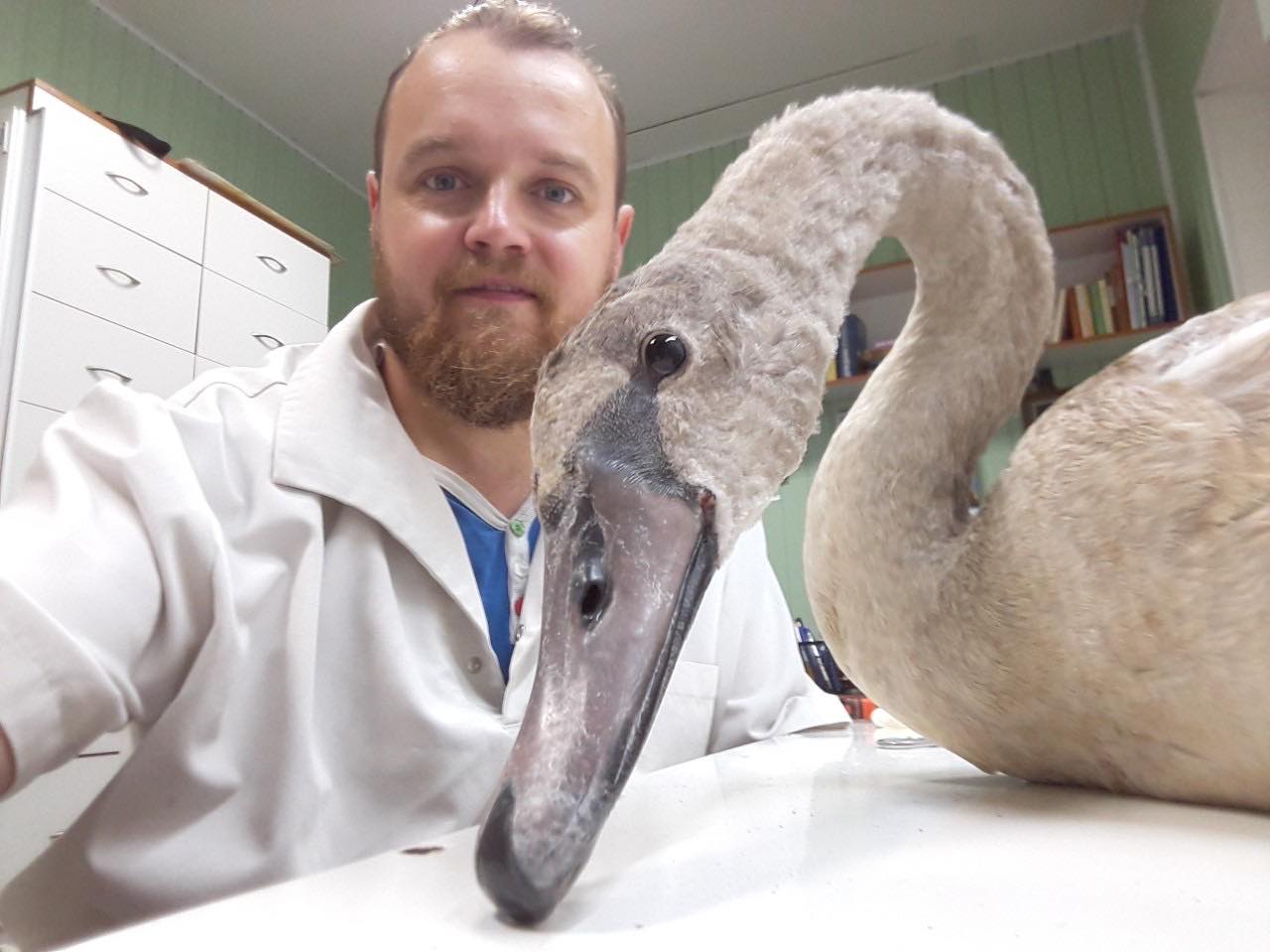 Одразу про це повідомили ветеринару з клініки «Айболить» Михайлові Андрусяку. Відклавши всі справи, чоловік вчасно приїхав і оперативно надав допомогу лебедеві. На добровільних засадах самотужки піймав, відвіз у ветеринарний центр, де професійно витягнув рибальські снасті з гачками.