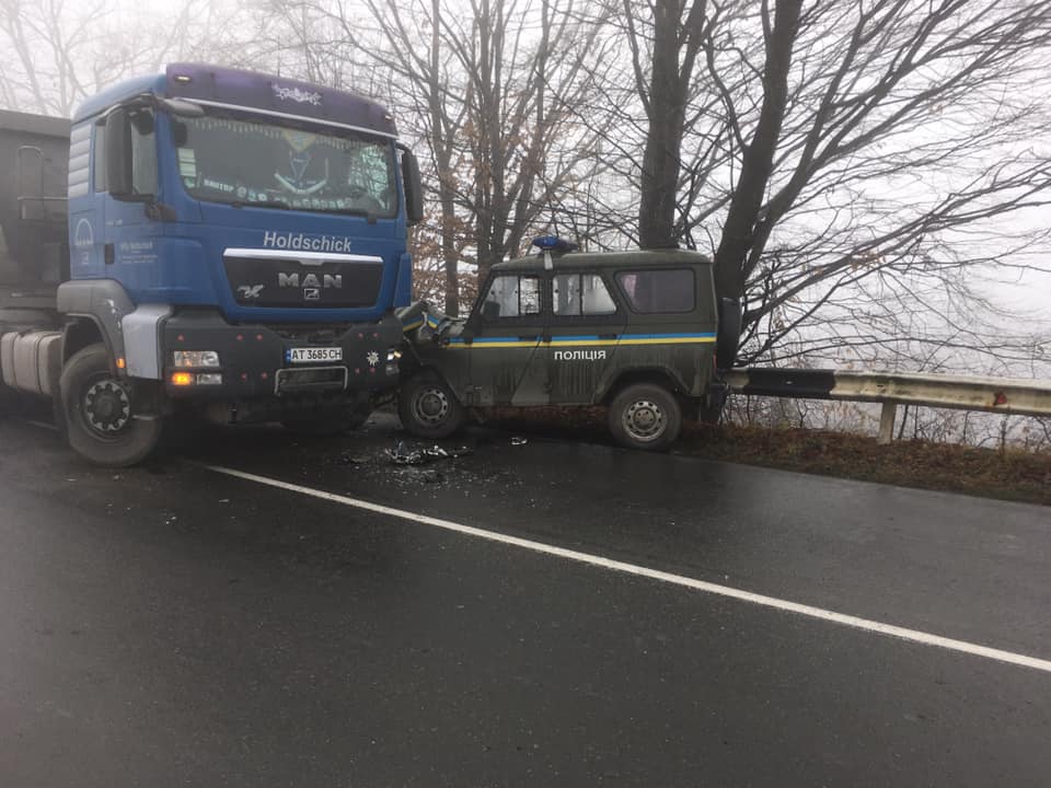 "Водій фури МАN здійснив обгін КамАЗа в забороненому місці, чим спричинив зіткнення з УАЗом поліції. Без жертв", - написав Мацьоцький.