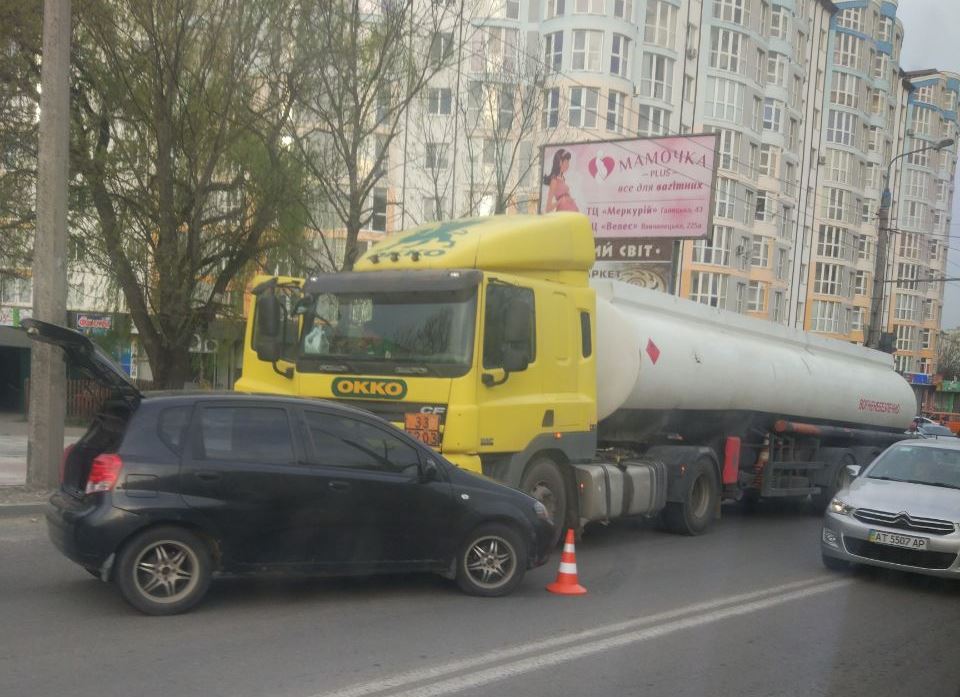 Як повідомляють свідки аварії в телеграм чаті AutoLife, біля магазину "Барбарис" зіткнулися бензовоз та легковик Chevrolet. В ДТП ніхто не постраждав.