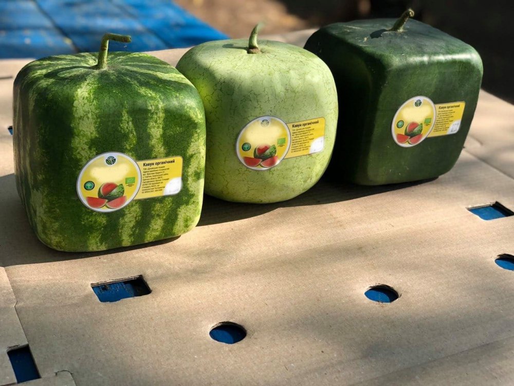Квадратні кавуни вирощують у Японії 30 років поспіль. За сезон отримують тільки 800 кавунів. Кожен дозріває у пластиковому або скляному ящику. У гривнях коштує понад 4 тис. грн.