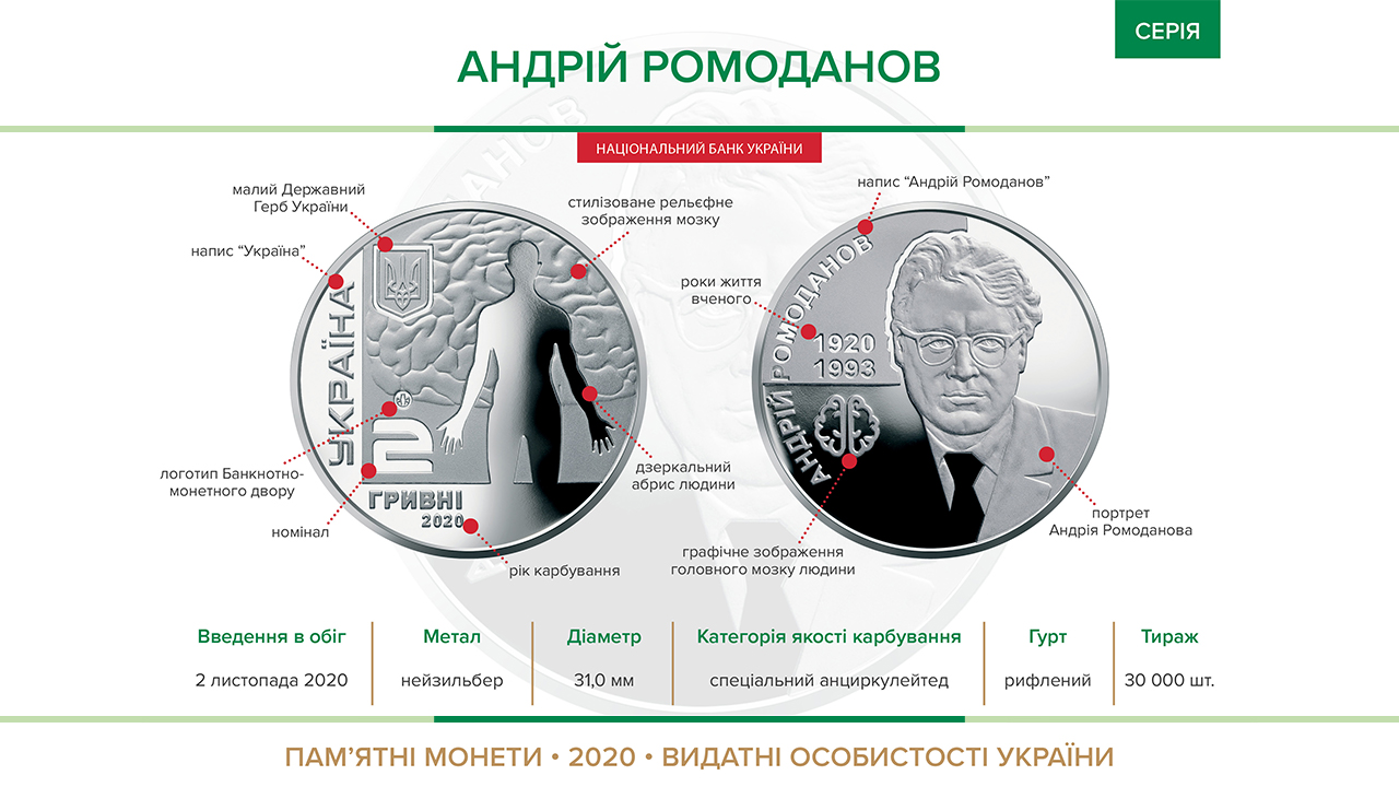 На одній стороні знаходиться портрет Ромоданова, роки його життя і рельєфне зображення мозку людини. На іншій – державний Герб України, напис "Україна", логотип монетного двору і рік випуску.
