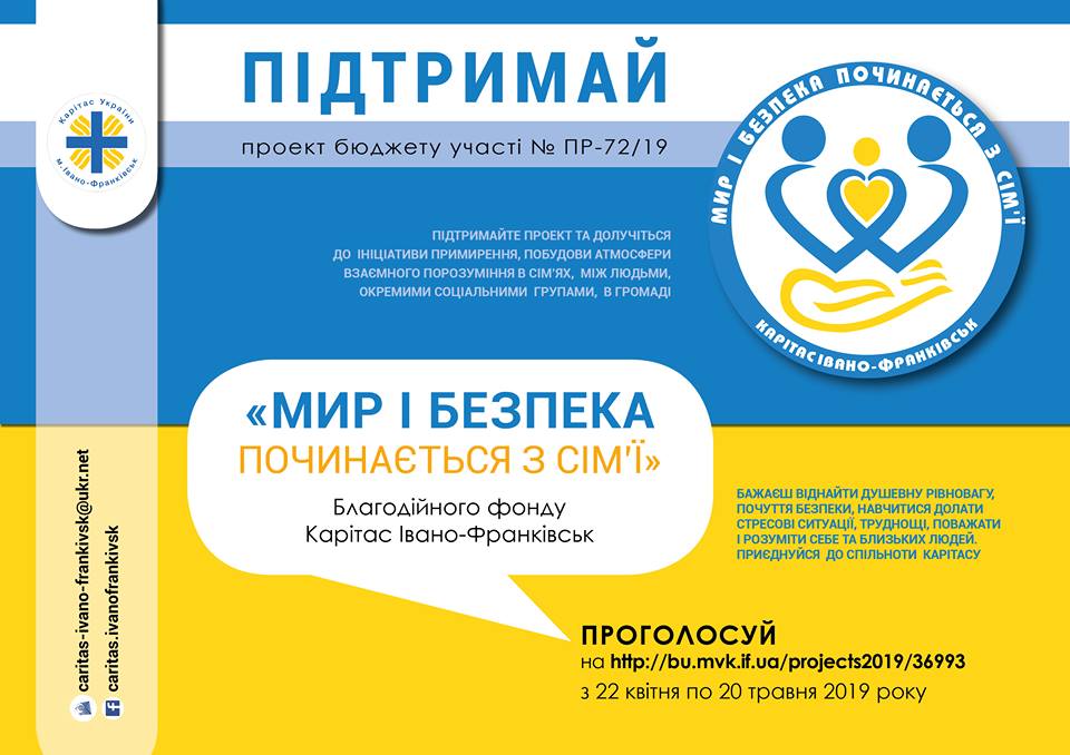 Проект «Мир і безпека починається з сім’ї» згуртує людей навколо найбільших цінностей – родина, батьки, діти. За допомогою заходів в рамках проекту Карітас допоможе кожному відновити свої життєві ресурси, налагодити і зміцнити сімейні стосунки, адаптуватися до мирного життя, подолати «застрягання у війні», стати більш толерантними один до одного у сім’ї та громаді.