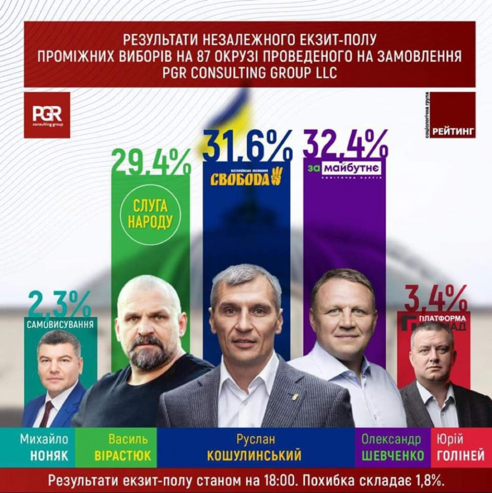 За результатами екзитполу, перемога за Олександром Шевченком ("За майбутнє"). Але, розрив між ним та свободівцем Русланом Кошулинським менше відсотка, а похибка — 1,8%. Тож після підрахунку голосів ситуація може кардинально змінитися.