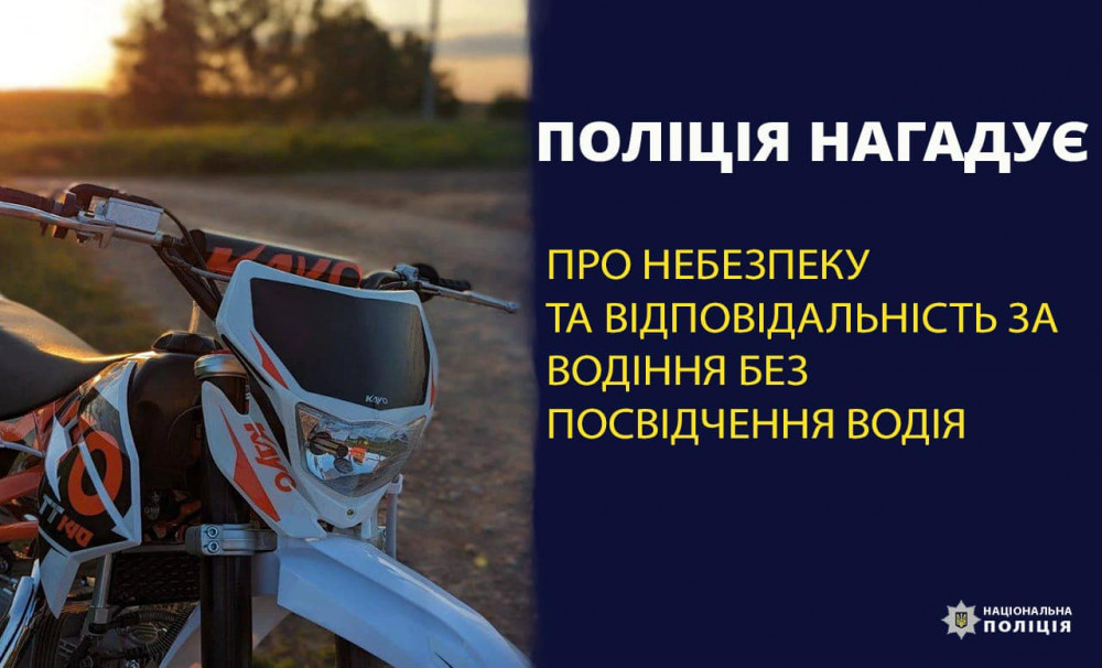 "Часто діти сідають за кермо транспортних засобів за мовчазної згоди своїх батьків! Поліцейські нагадують, право керувати транспортними засобами (автомобілями, квадроциклами) можна отримати після досягнення повноліття, тобто з 18 років. Керувати мотоциклом, мопедом чи скутером можна лише з 16-річного віку і тільки після отримання посвідчення водія відповідної категорії. Аби отримати посвідчення водія, необхідно пройти курси в автошколі, а після цього – успішно скласти іспит. Окрім цього, мотоцикл чи мопед повинен обов’язково бути зареєстрованим та мати номерний знак",- кажуть поліціянти.