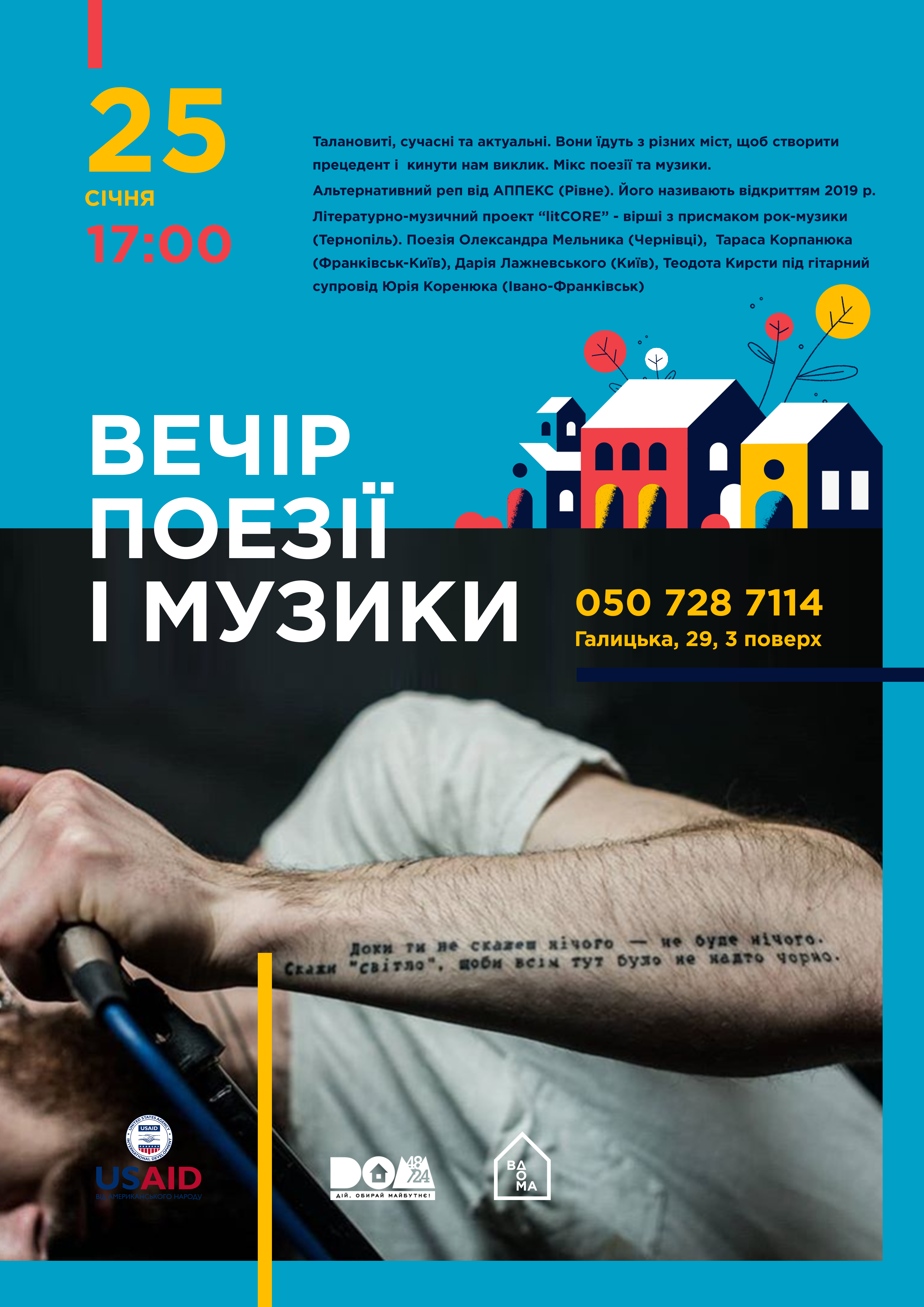 Отже, 25 січня о 17:00 ГО “Д.О.М. 48.24” запрошує франківців на “Вечір поезії та музики”, де свою творчість представлять молоді поетки та поети, музикантки та музиканти з різних міст України, а ви матимете можливість відшукати для себе нові сенси у їхній творчості.
