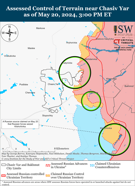 Російські війська нещодавно просунулися поблизу Часового Яру Російські війська також продовжували атакувати на північ від Часового Яру біля Калинівки, на схід від Часового Яру біля Іванівського та на південний схід від Часового Яру біля Кліщіївки та Андріївки.