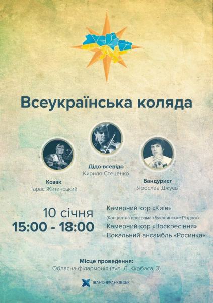 10 січня з 15 години в рамках проекту "Схід і Захід разом: Різдзво в Карпатах" відбудеться концерт "Всеукраїнська коляда". Учасники: Камерний хор "Київ", Камерний хор "Воскресіння", Вокальний ансамбль "Росинка".