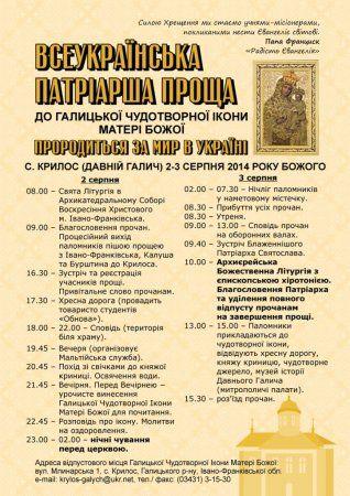 2-3 серпня 2014 року відбудеться Всеукраїнська Патріарша проща до Галицької чудотворної ікони Матері Божої в с.Крилос Галицького району. Розпочнеться проща 2 серпня 2014 року зі Святої Літургії в Архікатедральному і Митрополичому Соборі Святого Воскресіння м.Івано-Франківська о 8.00 год.