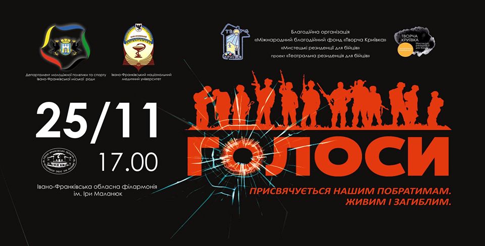 Майдан, Іловайськ, Донецький аеропорт, Дебальцеве, жахіття полону… На сцені страшна правда сьогодення, від якої не втекти, яка не залишає місця для байдужості чи непричетності. Вистава є спробою збудувати місток між суспільством й тими, хто воював, хто віддав своє життя за мир і спокій. «Наша вистава — це спроба дослідити еволюцію людини на війні та поза нею. Це спроба донести думку про те, що війна не зникла», - кажуть бійці. Нещодавно вистава «Голоси» з успіхом пройшли у Києві. Далі творча група мандрує Україною і ми радіємо, що у їхньому графіку є Франківськ :)