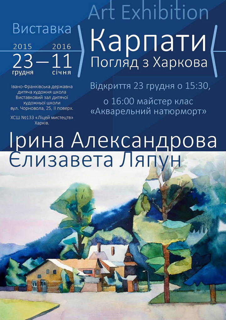 У середу, 23 грудня, о 15:30 в Івано-Франківську відкриється виставка акварелей художниці-викладача з Харківського ліцею мистецтв Ірини Александрової та її учениці Єлизавети Ляпун — “Карпати. Погляд з Харкова”.
