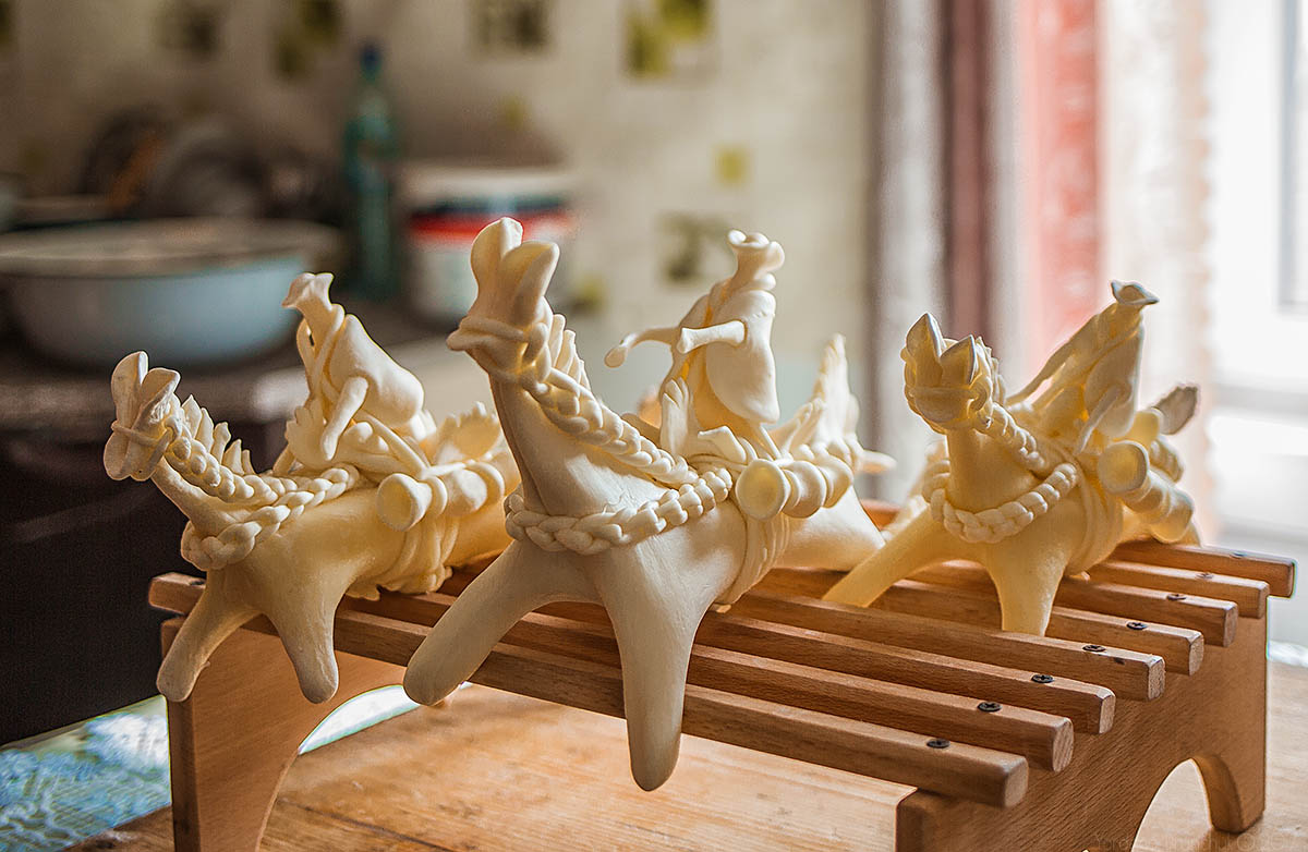 Мисткиня терпеливо вирізає коникам гриви і хвостики, далі захоплено робить сідло, вершника, плете косички з довгих сирних ниток, запрягає коника і садить вершника.
