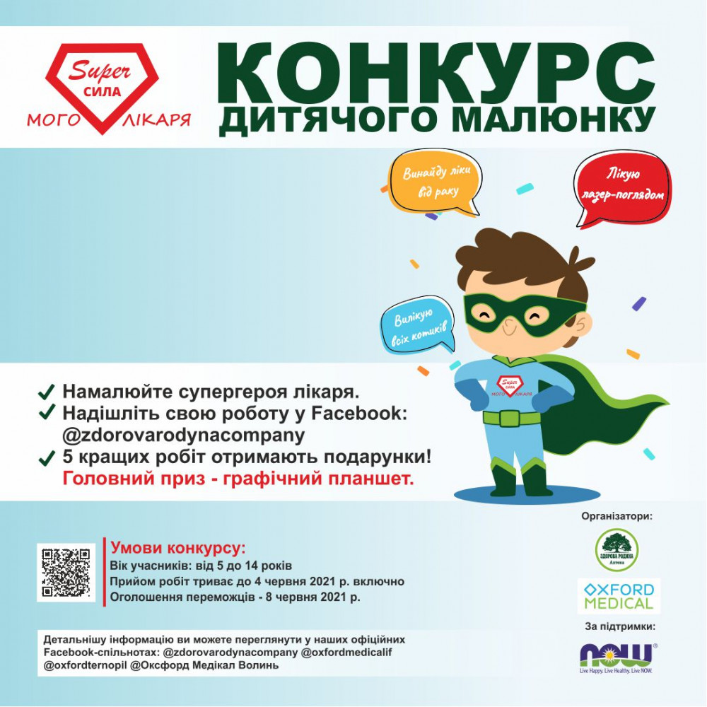 З 24 травня по 8 червня 2021 року мережа аптек «Здорова Родина» разом із медичними центрами «Oxford Medical» проводять онлайн-конкурс дитячих малюнків «Суперсила мого лікаря». Учасники – діти віком від 5 до 14 років.