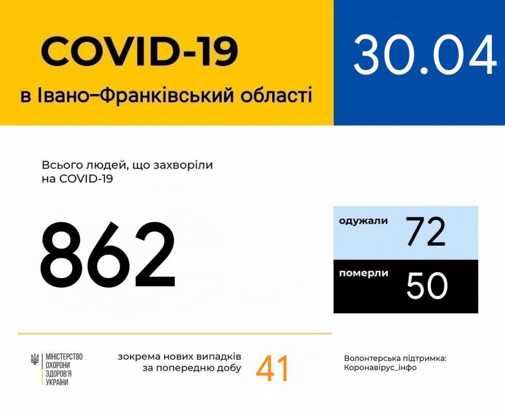 За даними ЦГЗ, станом на 9:00 30 квітня в Івано-Франківський області 862 (+41) лабораторно підтверджених випадків COVID-19, з них 50 летальні, 72 пацієнтів одужали.