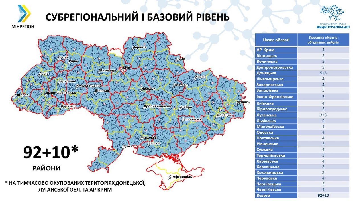 Це 92 райони, які знаходяться на підконтрольній території України і ще 10 – на тимчасово окупованій та у Криму. На Івано-Франківщині планують утворити п’ять районів з центрами в Івано-Франківську, Калуші, Надвірні, Коломиї та Косові.