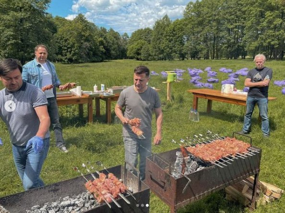 На фото Зеленський робить шашлик, позаду м'ясо на шампурах підносить керівник Офісу президента Андрій Єрмак. На галявині поставили мангали, намет, пише Gazeta.ua.