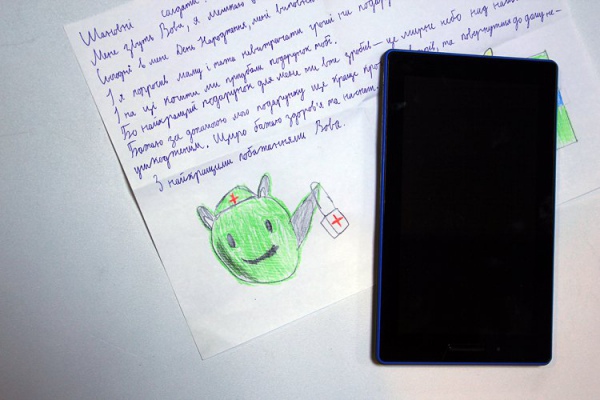 Але малий вирішив віддати девайс тим, кому він потрібніший. У подарунок військовим хлопчик додав лист із малюнками.